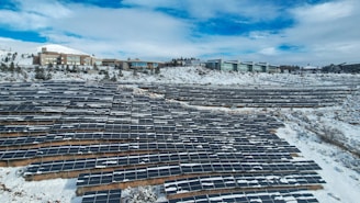 A large array of solar panels is installed across a snow-covered landscape, with modern buildings visible in the background. The sky is partly cloudy, adding a serene atmosphere.
