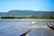 A series of solar panels laid out on a wooden deck are connected to a portable power station. The setup overlooks a scenic landscape featuring lush green fields, trees, and a few rustic houses in the background, suggesting a rural or countryside setting.