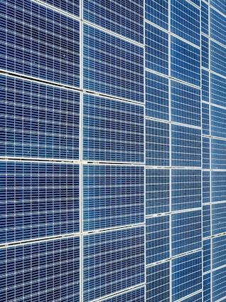 A large array of solar panels with a grid pattern, featuring dark blue and reflective surfaces aligned in a structured manner. The panels are arranged side by side, creating a uniform and organized layout.
